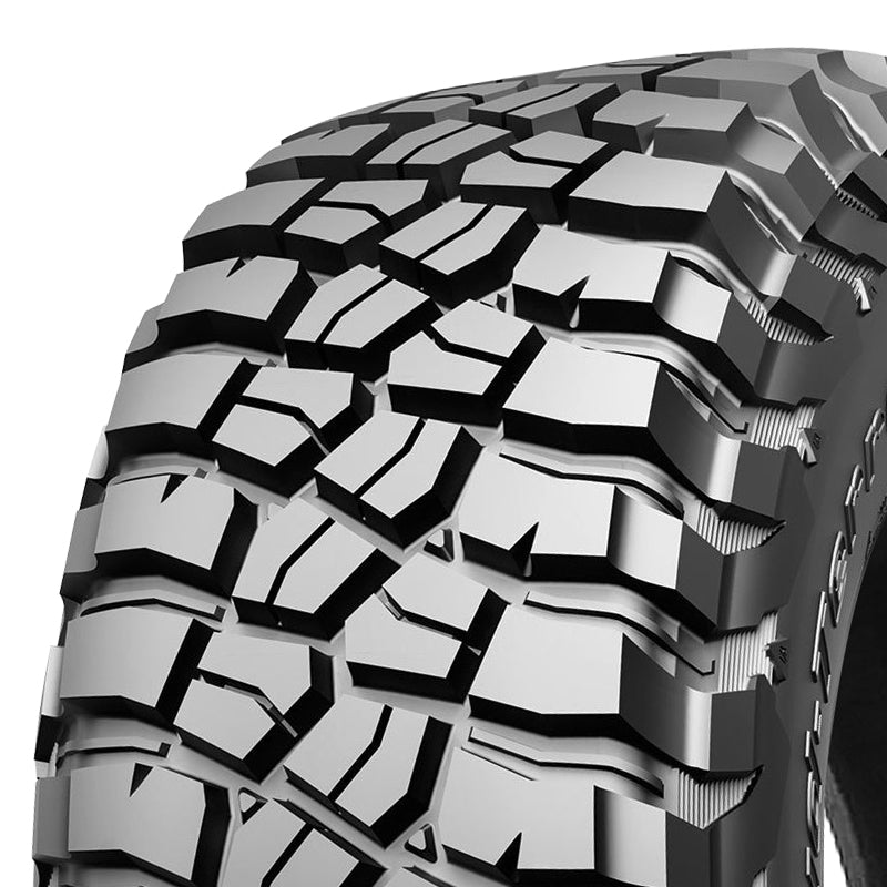 The BFGoodrich Mud-Terrain T/A KM3 is a mud terrain all season tire manufactured for light trucks. The tire ensures excellent off-road performance. The Terrain-Attack tread design’s large tread blocks improve the soft and loose terrain traction and also enable the model to maintain a firm grip on uneven terrain surfaces. In this manner, the tread enhances the tire’s usability on all off-road conditions. The staggered shoulder design increases the tire’s forward movement in deep mud and loose dirt, promoting better controllability. The tread pattern’s wide grooves feature Mud-Phobic bars that manage to keep the tire’s footprint clean. They eliminate mud and snow and eject rocks stuck between the tread elements. This resists stone retention from harming the tire and prevents the tread area from being blocked from its contact with the road surface.
