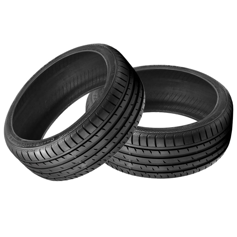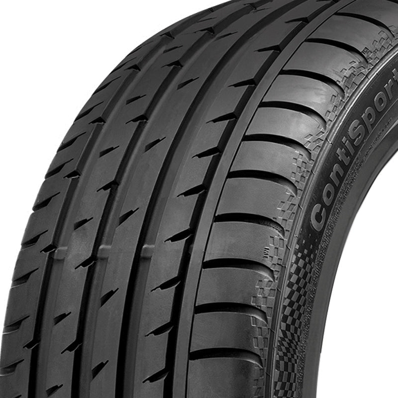 The Continental ContiSportContact 3 is a max performance summer tire with a highway tread manufactured for sporty passenger vehicles, such as sport coupes and luxury sedans. This model has excellent wet and dry traction thanks to the tread pattern and silica-based compound, but the tire will not perform well in winter conditions. The circumferential grooves in the tread pattern help evacuate water from beneath the tire, increasing its resistance to hydroplaning. This also greatly enhances the tire's wet traction. The tread design of the tire also enhances its braking capabilities. The tire's maximized contact with the road allows extra control and power, shortening the braking distance and making the tire safer. This constant road contact also helps reduce the road noise heard in the cabin of the vehicle, making the driving experience enjoyable. The steering precision and responsiveness are enhanced with this model by the solid tread blocks and the center rib of the tread pattern, and it improves the high speed stability as well. The asymmetric tread pattern offers exact precision and driving solidity, while also increasing the tire's balance, cornering ability and traction. The ContiSportContact 3's low rolling resistance combined with the lower weight of the tire compound provide faster acceleration, greatly increasing the tire's performance.