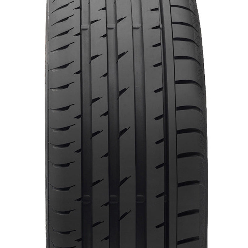 The Continental ContiSportContact 3 is a max performance summer tire with a highway tread manufactured for sporty passenger vehicles, such as sport coupes and luxury sedans. This model has excellent wet and dry traction thanks to the tread pattern and silica-based compound, but the tire will not perform well in winter conditions. The circumferential grooves in the tread pattern help evacuate water from beneath the tire, increasing its resistance to hydroplaning. This also greatly enhances the tire's wet traction. The tread design of the tire also enhances its braking capabilities. The tire's maximized contact with the road allows extra control and power, shortening the braking distance and making the tire safer. This constant road contact also helps reduce the road noise heard in the cabin of the vehicle, making the driving experience enjoyable. The steering precision and responsiveness are enhanced with this model by the solid tread blocks and the center rib of the tread pattern, and it improves the high speed stability as well. The asymmetric tread pattern offers exact precision and driving solidity, while also increasing the tire's balance, cornering ability and traction. The ContiSportContact 3's low rolling resistance combined with the lower weight of the tire compound provide faster acceleration, greatly increasing the tire's performance.