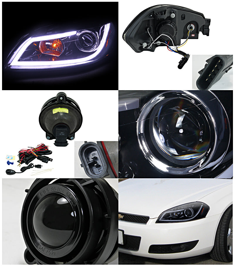 Coolstuffguru Compatible with Chevy Impala Glossy Black LED DRL Projector Headlights+Smoke Fog Lamps