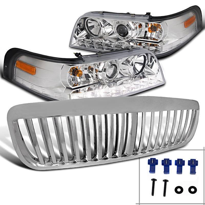 Coolstuffguru Compatible with Crown Victoria Chrome LED Proejctor Headlights+Vertical Hood Grill