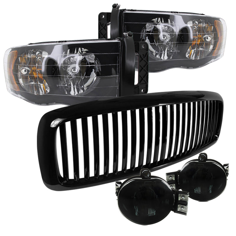 Coolstuffguru Compatible with Dodge Ram 1500 2500 3500 Black Headlights, Vertical Grill, Smoked Fogs Lligh