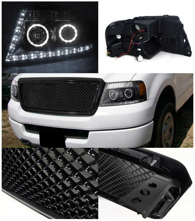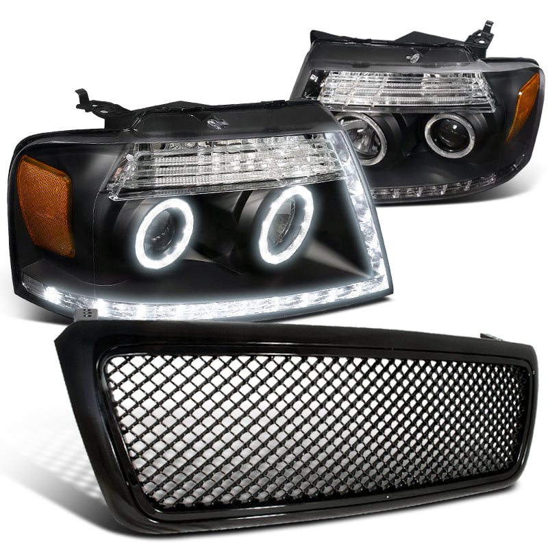 Coolstuffguru Compatible with Ford F150 Black Halo R8 LED DRL Projector Headlights+Mesh Hood Grill