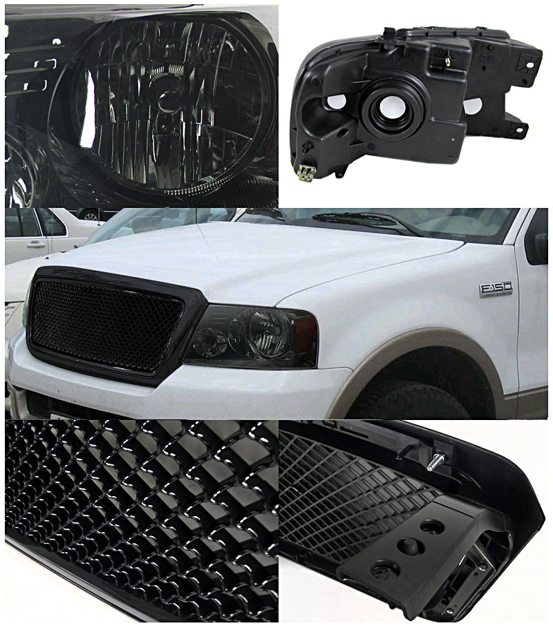 Coolstuffguru Compatible with Ford F150 Smoke Crystal Headlights+Black Mesh Hood Grille
