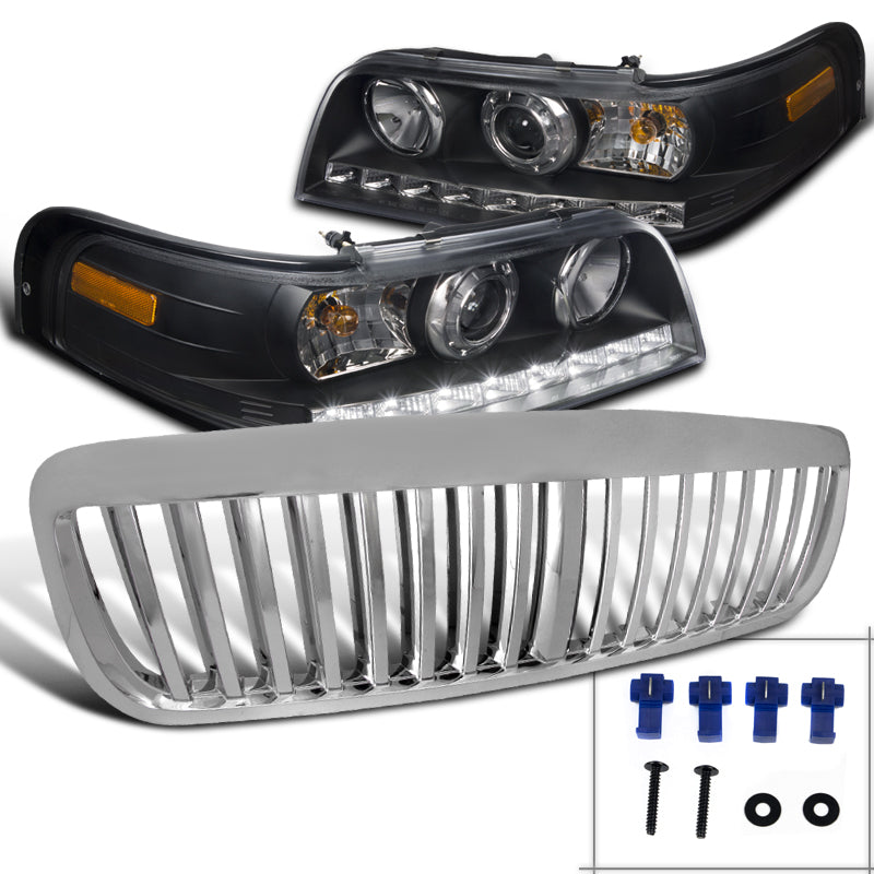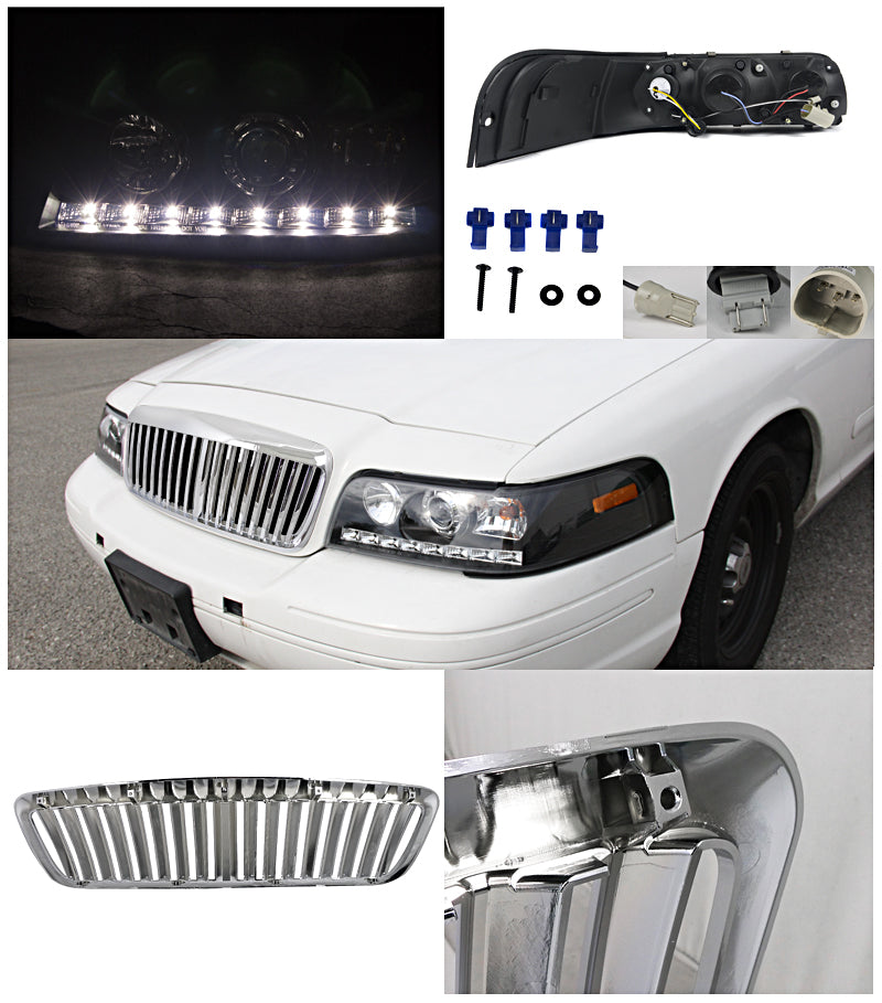 Coolstuffguru Compatible with Frod Crown Victoria Black LED Proejctor Headlights+Chrome Hood Grill
