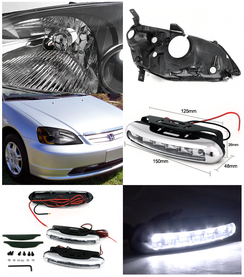 Coolstuffguru Compatible with Honda Civic Black Crystal Headlight Replacement Pair+DRL 6-LED Bumper Fog La