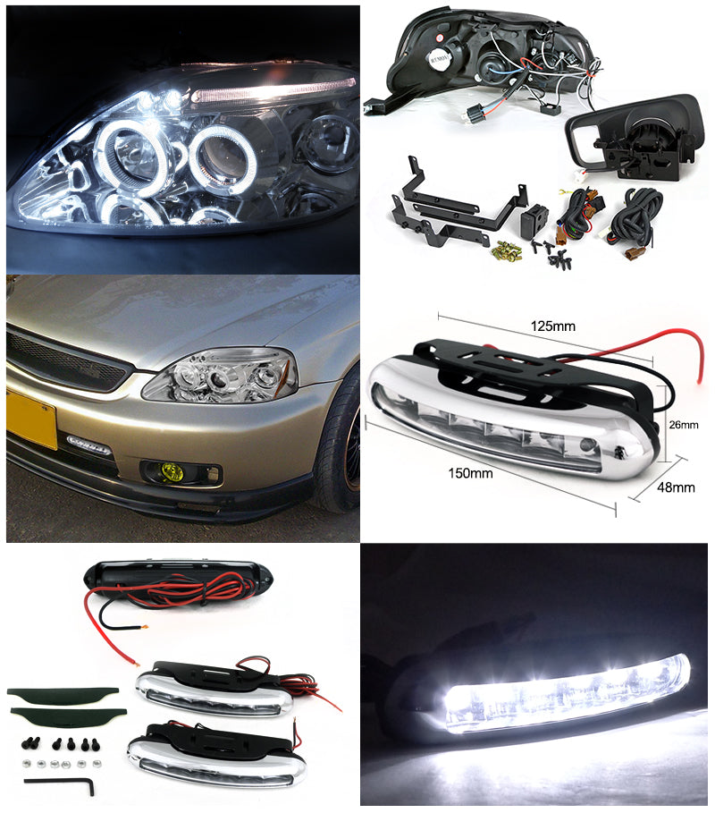 Coolstuffguru Compatible with Honda Civic Chrome Projector Headlights+Yellow Bumper Fog Lamp+6-LED DRL 600