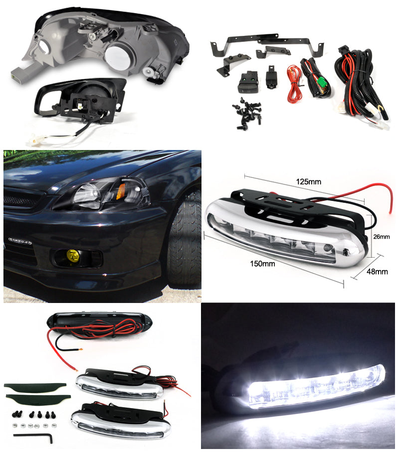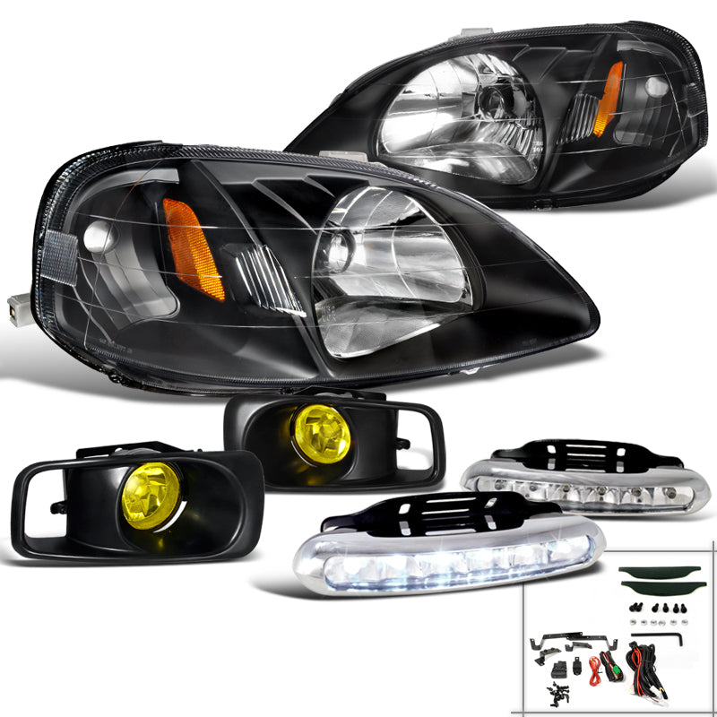 Coolstuffguru Compatible with Honda Civic Coupe Sedan Black Headlight+Yellow Fog Lamp+LED White DRL