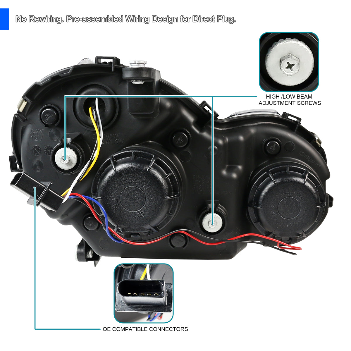 headlights Description: Brand new in original packaging. Exactly the same as shown in the picture! High quality black housing clear lens projector headlights with LED DRL (Daytime Running Light) strip & LED turn signal. These lights are made by an OE approved and ISO certified manufacturer with the quality meet or exceed all OE standards. Professional installation is recommended.