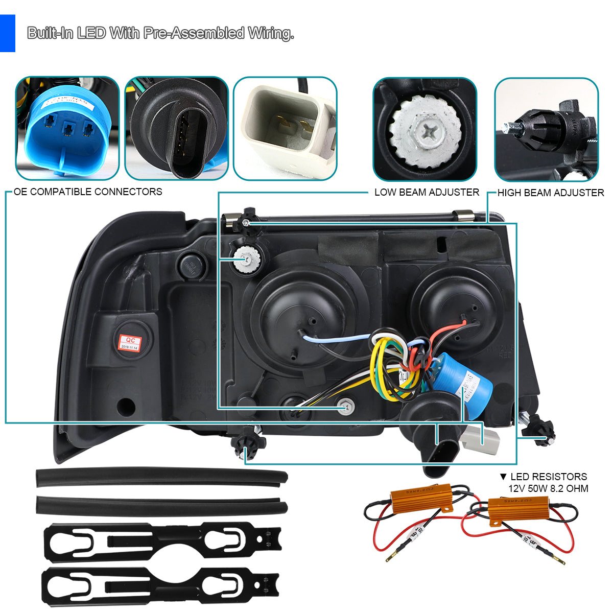 100% Brand new in original packaging. Comes with one pair of LED strip projector headlights with turn signal and side marker light. Built-In LED With Pre-Assembled Wiring. High quality of polished black housing clear lens. Headlights are equipped with H1 light bulbs for High/Low beam lights. Made by an ISO certified manufacturer with quality that meets strict OE standards. In order to install properly, Professional installation is recommended.