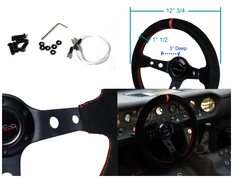 Brand new in original packaging. Exactly the same as shown in the picture! Come with 320mm and 3" deep dish style steering wheel. Made by light-weight aluminum and wrapped with genuine black suede leather, red trim and stitch. Horn button, bolts, installation tool and wiring are included. Direct replacement, no modifications needed. Accepts all standard 6-bolt hub adaptor kit ( Momo, Sparco, Nardi, etc ). Fitment: Compatible with/Replacement For Universal fit for most vehicles.