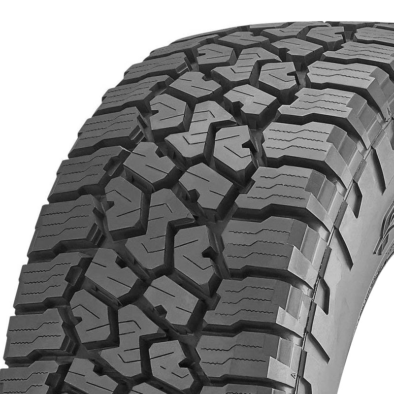 The Falken Wildpeak A/T3W is an all terrain, all season tire manufactured for SUVs and light truck vehicles. The tire offers excellent all weather traction thanks to the silica tire compound and the deep tread grooves. They maintain road contact and firmly grip the road surface in dry, wet and winter weather. The deep tread grooves also disperse water and slush from below the tire footprint to improve the model’s hydroplaning resistance. The deep grooves clean out mud and snow from between the tread elements, enhancing the traction. The better road gripping ability and hydroplaning resistance increase the tire’s year round driving safety levels.
