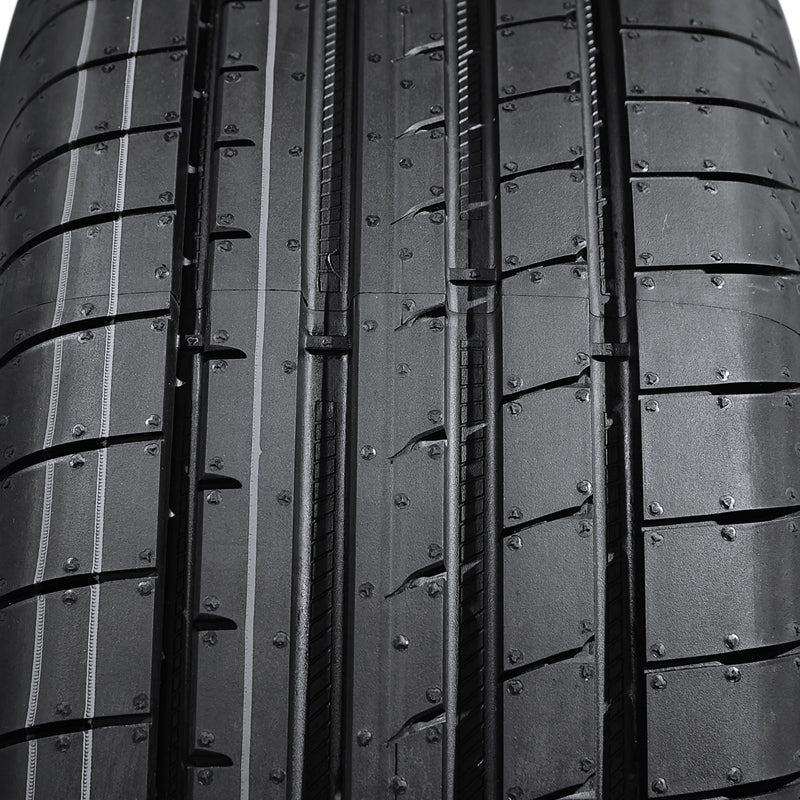 The Goodyear Eagle F1 Asymmetric is a high performance summer tire manufactured for passenger vehicles. The tire was manufactured with a special tread blend. It contains carbon black that boosts the dry weather traction, silica that increases the wet weather performance and polymer that enhances the tread stiffness. The combination of these three allow the tire to perform excellently at high speeds in dry and wet conditions. The summer weather traction is further upgraded with the asymmetric tread design and the hydroplaning resistance of the wide circumferential grooves. While the tire has first-rate summer weather traction, it will not perform well in winter weather as the tread will not maintain its flexibility. The special polymer-enhanced tire compound ensures the tread's optimal stiffness, which is needed to increase the model's controllability. The steering responsiveness and driving stability are enhanced in this manner. The steering becomes swift and precise in its response to the driver's instructions and tire's shape is stabilized against the driving pressure affecting it. The tread block design of the outer shoulder and the active CornerGrip technology boost the cornering ability and power. The tread blocks promote additional biting edges, while the CornerGrip technology maintains even tread pressure to ensure a safer maneuvering ability. The Eagle F1 Asymmetric guarantees a safer high speed performance. The internal structure features twin steel belts reinforced with a three-layer spiral wrapped polyamide cord that enhances the tread stability and the high speed durability. The tire does not deform under the driving pressure which allows it to perform to its highest capability. The tire's sidewall was manufactured in a way that it protects the rims from accidently curb manages, further upgrading the high speed driving safety.