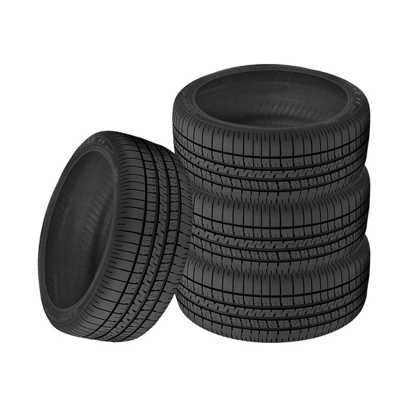 The Goodyear Eagle F1 Supercar is a high performance summer tire manufactured for passenger vehicles. The tire offers great summer weather traction. The summer weather tire compound and the ribbed tread pattern design work together to increase the dry and wet weather road gripping ability. The compound maintains its flexibility in such conditions, and it actively resists heat build-up on the tread area. The ribbed tread design firmly grips the road surface to boost the high speed driving safety in these conditions. The circumferential grooves prevent hydroplaning by dispersing water from beneath the tire's footprint. The enhanced traction and hydroplaning resistance ensure a safer summer weather performance. The model was manufactured with a stronger internal structure. The reinforced twin steel belt construction upgrades the tire's high speed durability. It maintains the tire's optimal shape under the high speed driving pressure affecting the model. It actively prevents the deformation the tire's shape and improves its high speed performing capability. The stronger construction combined with the compound's prevention of heat build-up during the drive, enables the tire to securely perform to its best high speed ability. The Eagle F1 Supercar is easily controlled. The race-inspired ribbed tread design maintains the tire's road contact at all times, which effectively upgrades its steering responsiveness and driving stability. The steering becomes faster and more precise in its responsiveness to the driver's instructions, while the structure is stabilized against the driving pressure affecting the model. The larger outer shoulder tread blocks increase the cornering and maneuvering ability with the tire's extra biting edges. The biting edges consistently grip the road surface during cornering to guarantee better control over the vehicle in such situations.