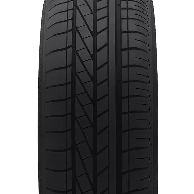 The Goodyear Excellence is a high performance summer tire manufactured for passenger vehicles. The special tread pattern and the polymer tire compound work together to increase the dry and wet weather road gripping ability. This excellent summer weather traction guarantees a safer driving experience in all hot temperature conditions and allows the driver to confidently control the vehicle. The wide circumferential and lateral grooves actively resist hydroplaning situations by eliminating water from below the tire footprint. This model, however, is not capable of handling winter weather, as the tire compound does not maintain its flexibility and traction in colder temperatures. The tire promotes a longer lasting tread life. The unique asymmetric tread pattern increases the tread life and tire usability by preventing irregular wear patterns from forming across the tread area. This is achieved as the tread design equally distributes the forces of acceleration, braking and cornering across the tread area, which prevents the driving pressure from concentrating on one area of the tread. The even distribution of the driving pressure and the asymmetric tread's variable pitch design also lower the road noise heard in the vehicle's cabin. While the tires are in motion, the tread design creates a sound frequency that negates the road noise generated. This guarantees a quiet and increased performing ability. The Excellence's tread design features a continuous rib and shoulder tread block sequences that enhance the model's controllability. The maintained road contact increases the steering responsiveness and driving stability, which boosts the model's handling. The steering becomes more precise and its response time quicker, while the tire is secured against the driving pressure affecting it. The shoulder tread block sequence also increases the cornering ability and power greatly by providing additional biting edges in maneuvering situations. The polymer tire compound improves the model's braking with its superb traction even in wet weather. The better road grip enables the tire to shorten its braking distance and offer safer driving experience.