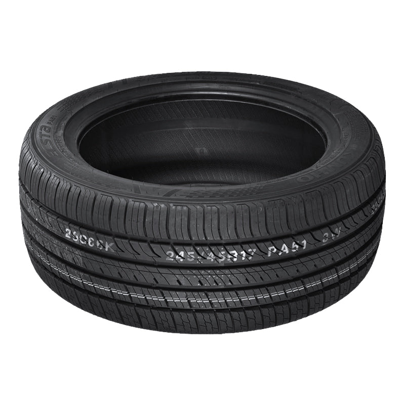 The Kumho Ecsta PA51 is a performance and high performance, depending on the speed rating, all season tire manufactured for passenger vehicles. The tire promotes great all weather traction. The silica-based tire compound and the asymmetric tread pattern increases the tire's grip on dry, wet and winter weather roads. The silica in the tire's rubber material maintains its flexibility in various weather, including in colder temperatures. The asymmetric tread's siping and notch pattern helps improve the grip the tire has on the road surface. These tread elements heighten the number of biting edges gripping the road surface which guarantees a secure driving experience. The circumferential grooves prevent hydroplaning by dispersing water and slush from below the tire's footprint. The better traction and hydroplaning prevention guarantee a secure driving experience. The model's controllability is enhanced with its tread pattern. The tread's continuous center ribs keep the tire's contact with the road surface at all times, which upgrades the steering responsiveness and the driving stability. The better contact with the road surface boosts the tire's steering response time and accuracy to the driver's commands, while it secures the structure against the driving pressure affecting the model. The tread's wider shoulder tread block pattern upgrades the cornering capability. These blocks increase the number of biting edges gripping the road surface to improve the cornering and maneuvering ability. The maintained road contact and optimal tire shape and the silica-compound's prevention of heat build-up work together to significantly enhance the high speed performance and driving ability. The tire's balanced footprint and tread pattern advance the tread life. The maintained road contact upgrades the tire's contact with the road surface, which enhances the pressure distribution along the tread area. As a result, the driving pressure is evenly circulated on the tire's surface. This equally spread out force of acceleration, cornering and braking avoid the formation of irregular tread wear formations. The longer lasting tread life elongates the tire's usability making the tire more cost-efficient. The Ecsta PA51 offers a quiet performance. The tread design features a special variable pitch sequence which decreases the road noise levels heard during the drive. The pitch phase shift of the tread ribs creates a unique sound frequency that lowers the road and tread pattern noise heard in the vehicle's cabin. While the tires are in motion, the road and tread pattern noise does not ruin the driving enjoyment of the passengers, which guarantees a quiet and comfortable driving experience.