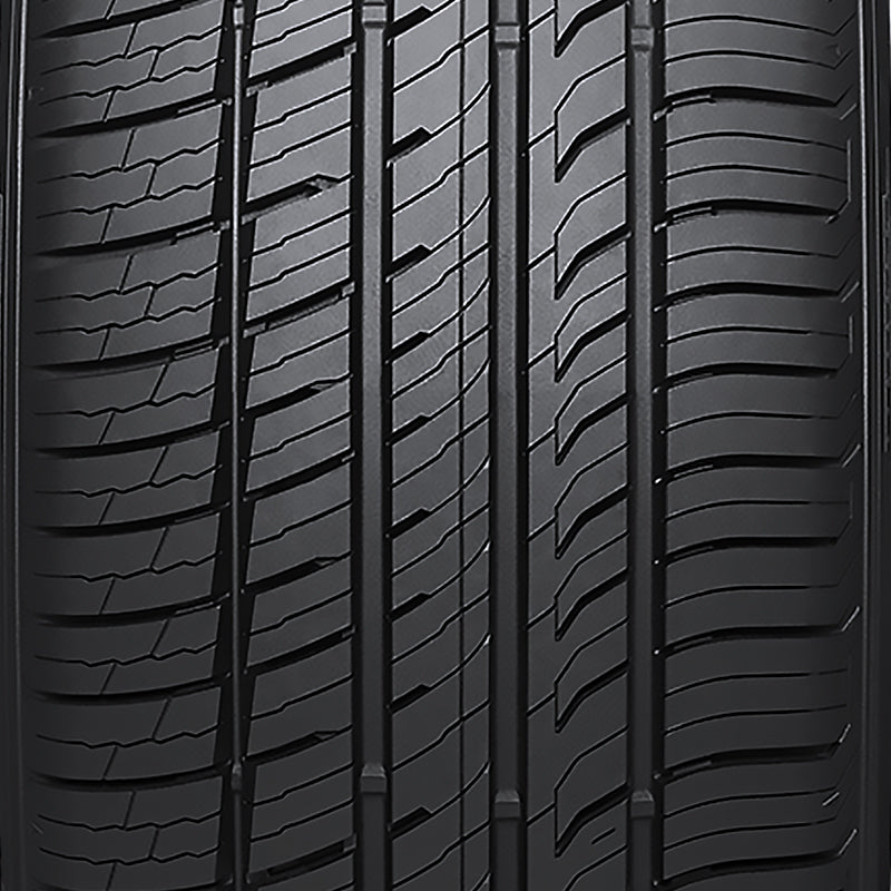 The Kumho Ecsta PA51 is a performance and high performance, depending on the speed rating, all season tire manufactured for passenger vehicles. The tire promotes great all weather traction. The silica-based tire compound and the asymmetric tread pattern increases the tire's grip on dry, wet and winter weather roads. The silica in the tire's rubber material maintains its flexibility in various weather, including in colder temperatures. The asymmetric tread's siping and notch pattern helps improve the grip the tire has on the road surface. These tread elements heighten the number of biting edges gripping the road surface which guarantees a secure driving experience. The circumferential grooves prevent hydroplaning by dispersing water and slush from below the tire's footprint. The better traction and hydroplaning prevention guarantee a secure driving experience. The model's controllability is enhanced with its tread pattern. The tread's continuous center ribs keep the tire's contact with the road surface at all times, which upgrades the steering responsiveness and the driving stability. The better contact with the road surface boosts the tire's steering response time and accuracy to the driver's commands, while it secures the structure against the driving pressure affecting the model. The tread's wider shoulder tread block pattern upgrades the cornering capability. These blocks increase the number of biting edges gripping the road surface to improve the cornering and maneuvering ability. The maintained road contact and optimal tire shape and the silica-compound's prevention of heat build-up work together to significantly enhance the high speed performance and driving ability. The tire's balanced footprint and tread pattern advance the tread life. The maintained road contact upgrades the tire's contact with the road surface, which enhances the pressure distribution along the tread area. As a result, the driving pressure is evenly circulated on the tire's surface. This equally spread out force of acceleration, cornering and braking avoid the formation of irregular tread wear formations. The longer lasting tread life elongates the tire's usability making the tire more cost-efficient. The Ecsta PA51 offers a quiet performance. The tread design features a special variable pitch sequence which decreases the road noise levels heard during the drive. The pitch phase shift of the tread ribs creates a unique sound frequency that lowers the road and tread pattern noise heard in the vehicle's cabin. While the tires are in motion, the road and tread pattern noise does not ruin the driving enjoyment of the passengers, which guarantees a quiet and comfortable driving experience.